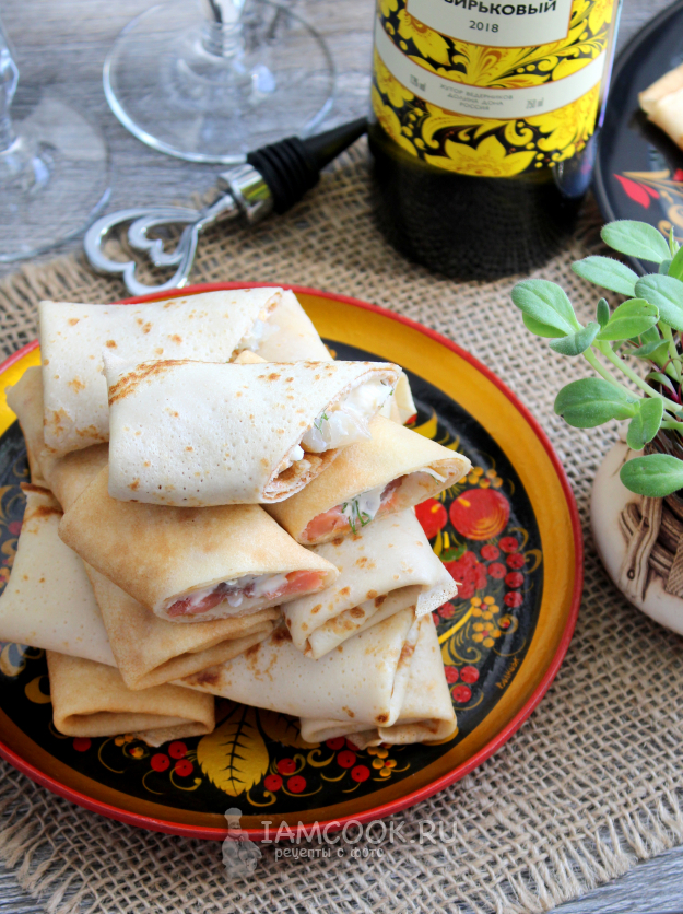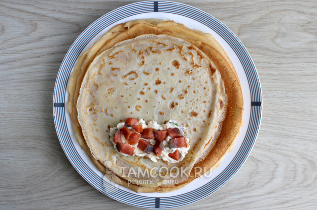 На каждый блин нужно намазать творожную начинку в количестве 1,5 ст.л. и добавить кусочки рыбы. Сверните блины с начинками конвертом или иначе по своему желанию.