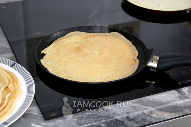 Испеките блины. Перед первым блином смажьте слегка сковороду растительным маслом и разогрейте её на огне выше среднего. Наливайте порцию блинного теста на подготовленную сковороду и дайте ей растечься. Жарьте блинчики с двух сторон.