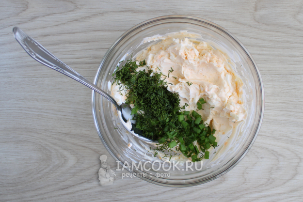 Вмешайте зелень в творожно-яичную начинку.