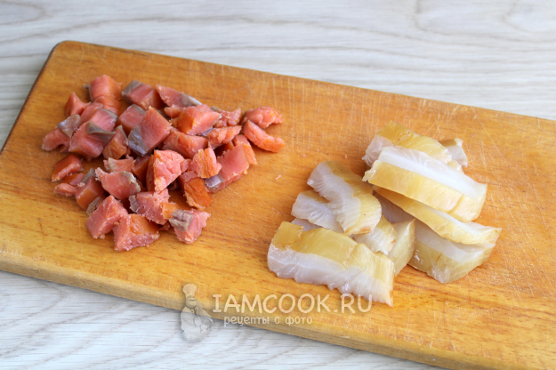 Копченую рыбу нарежьте кубиком.