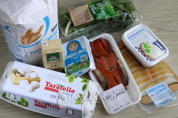 Для блинов с копченой рыбой подготовьте ингредиенты по списку к рецепту. Блинное тесто предлагаю простое - на воде и молоке. Рыба тут - кета и палтус холодного копчения. Творожный сыр подходит разный: простой, сливочный, крем чиз и т.д. Яйца для начинки нужно заранее сварить вкрутую. У меня были петрушка, укроп и перо лука, всё это отправила в начинку, но можно и что-то одно из этого. Микрозелень - тоже в тему.