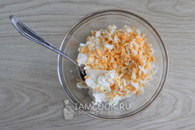 Для начинки соедините творожный сыр с тёртым яйцом.