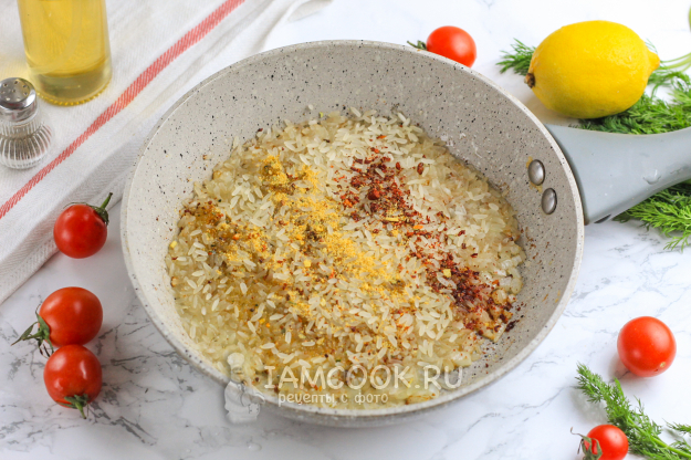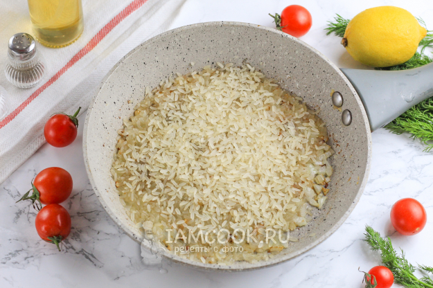 Репчатый лук очистите от шелухи, промойте и нарежьте мелкими кубиками. Обжарьте на растительном масле на сковороде примерно 3-5 минут, до румяности. Всыпьте промытый рис и перемешайте.