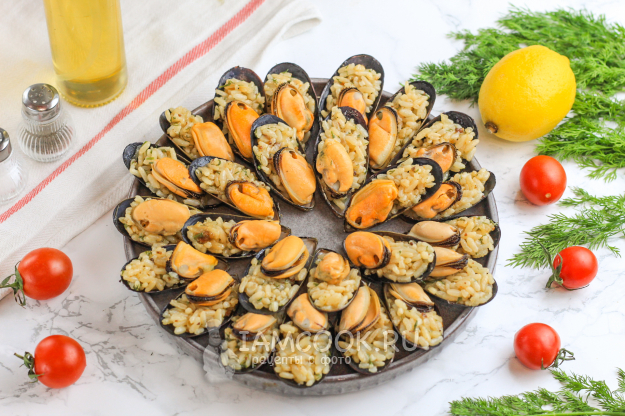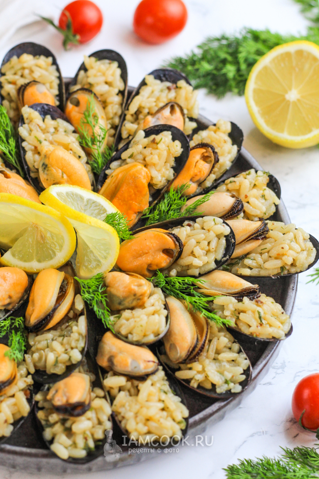 Украсьте нарезкой лимона и сбрызните лимонным соком. Подайте фаршированные мидии с рисом к столу теплыми с различными соусами.