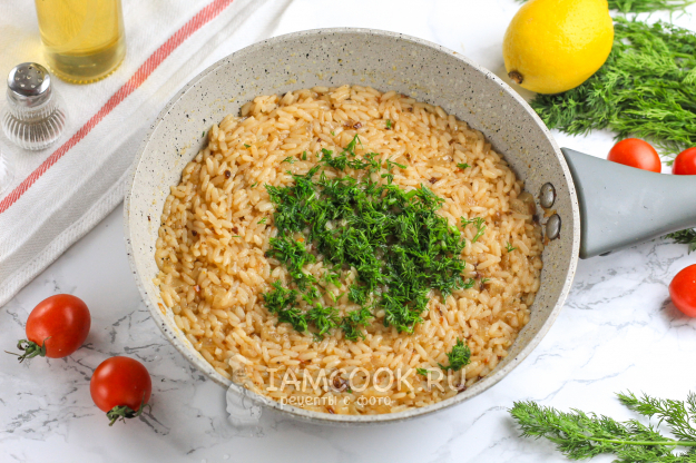 Убавьте нагрев до среднего и проварите рис под крышкой примерно 10-12 минут. Если жидкости будет мало, то долейте немного еще. Промойте свежую зелень укропа, петрушки или кинзы, измельчите. Добавьте в емкость и перемешайте. Выключите нагрев и дайте рису набухнуть под крышкой еще 5-10 минут.