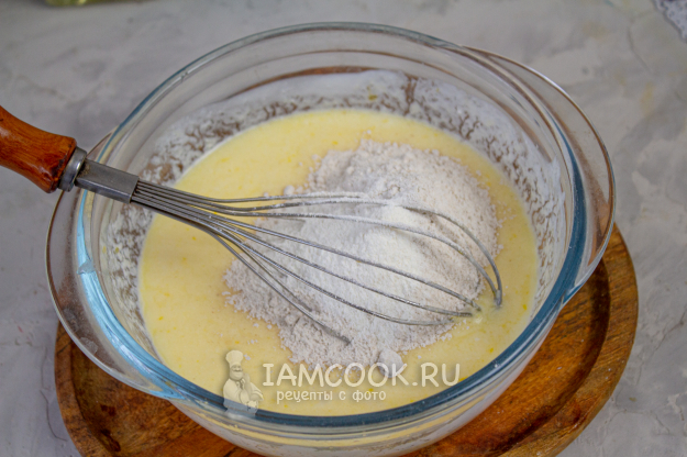 Всыпьте гречневую муку и разрыхлитель. Перемешайте до однородного теста, без комочков.