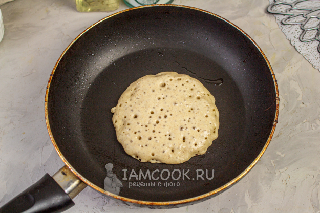 Смажьте сковороду растительным маслом и нагрейте на умеренном огне. Выложите немного теста, обжаривайте с одной стороны, пока верхняя часть не покроется пузырьками, а нижняя не подрумянится.