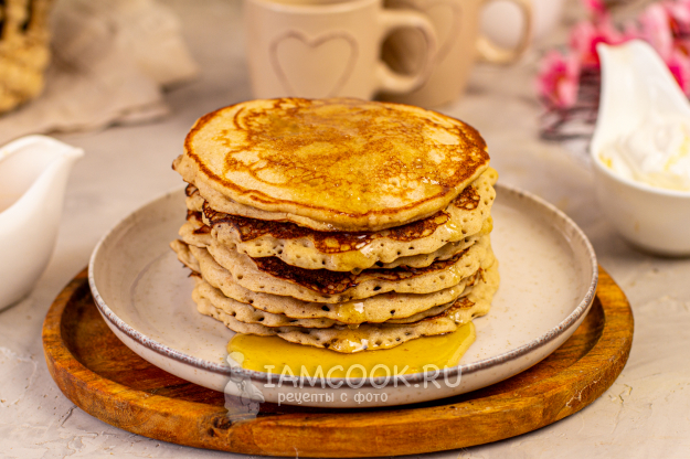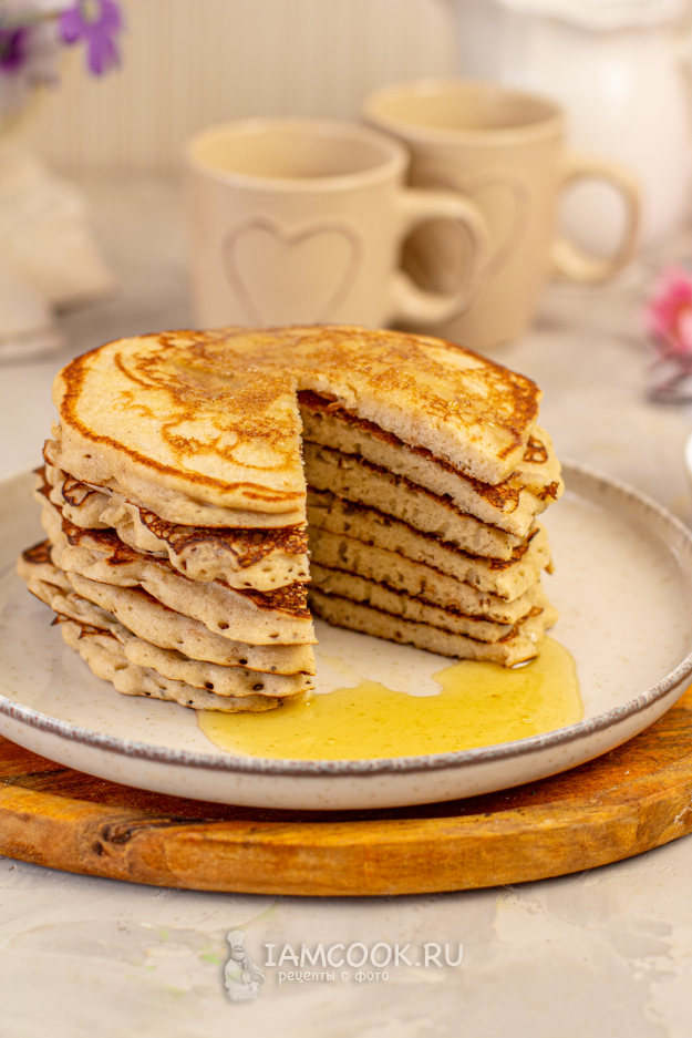 Готовые панкейки из муки зеленой гречки сложите стопочкой на блюдо. Подавайте с медом, сиропом, сметаной и ягодами.