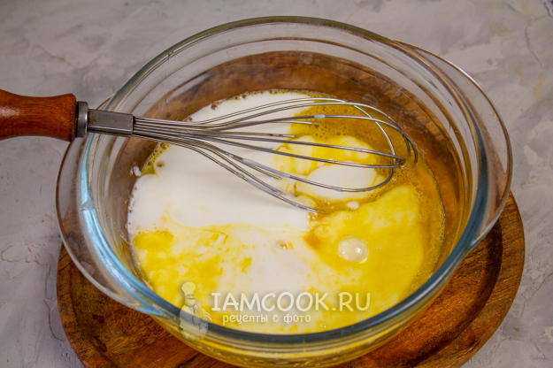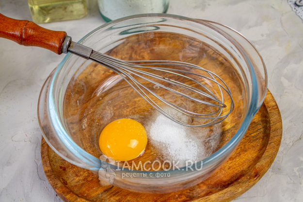 В миску вбейте яйцо, добавьте соль, ванилин и подсластитель. Перемешайте венчиком.
