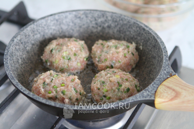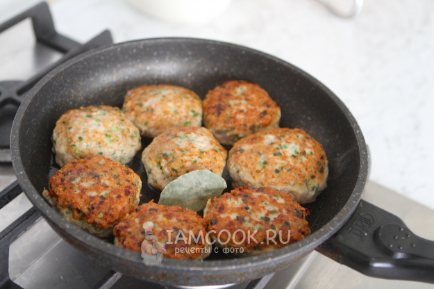 Разогреть сковороду с маслом. На максимальном огне обжарить поочередно куриные котлеты с зеленью с двух сторон до румяной корочки, примерно по 2 минуты.