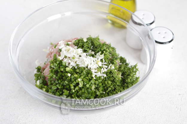 Зелень промыть, обсушить бумажным полотенцем и измельчить.