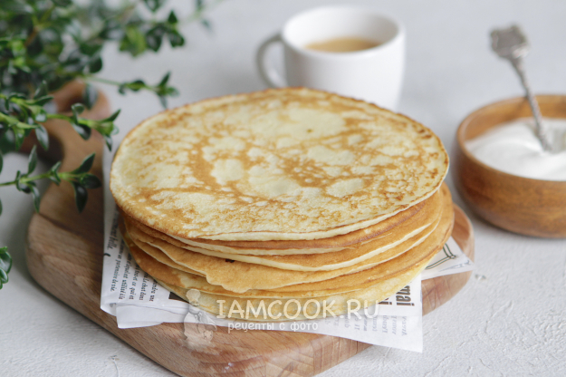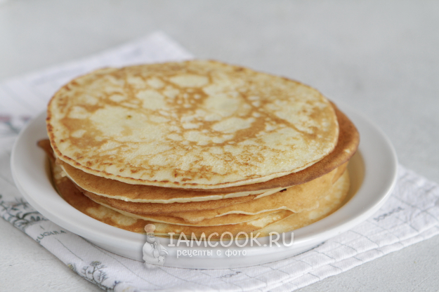 Готовый блин снять со сковороды, смазать маслом и желательно убрать под крышку. Выпекать блины один за другим, пока не закончится тесто.