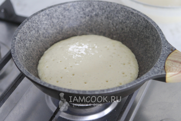 Хорошо разогрейте сковороду и слегка смажьте ее маслом. Налейте в нее чуть больше половины половника теста, распределяя его по всей поверхности.