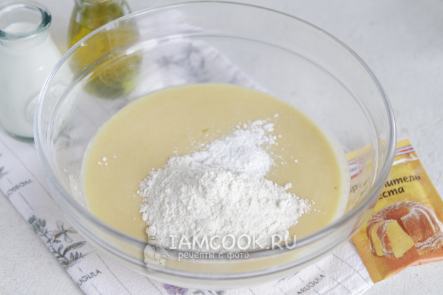 Слегка венчиком размешать все ингредиенты и ввести пшеничную муку, соль и разрыхлитель.