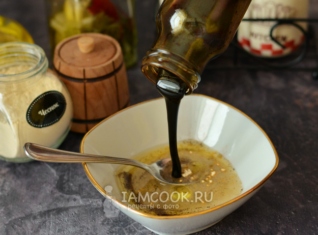 Для маринада смешайте соль, перец, чесночный порошок, масло, уксус и добавьте тростниковую мелассу. Меласса придаст сладость, пикантность и красивый цвет. Можете заменить мелассу коричневым сахаром или тёмным мёдом.
