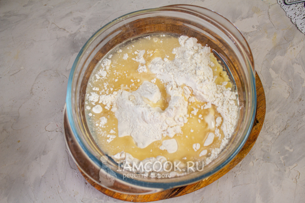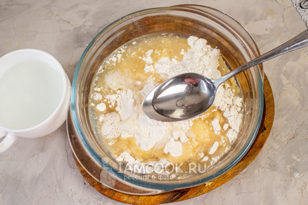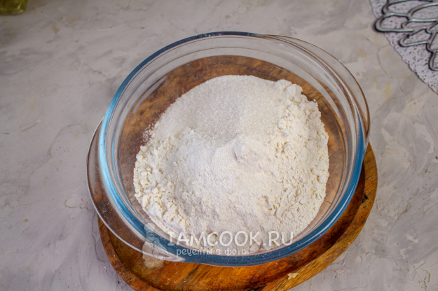 Соедините в миске сухие ингредиенты: муку, соль, разрыхлитель и сахар.