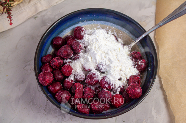 Для начинки я использовала вишню, не размораживая ее. Замороженную вишню выложите в подходящую посуду и смешайте с кукурузным крахмалом и сахаром.