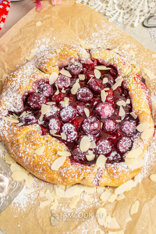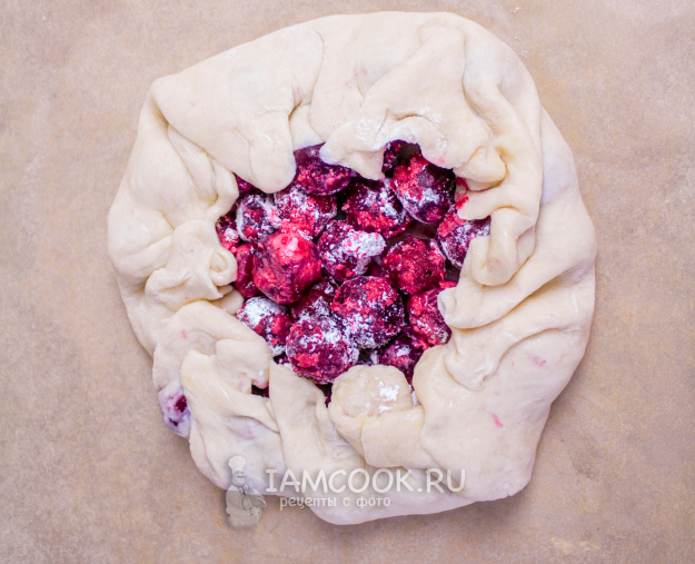 Выложите вишню в центр круга, не доходя до краёв 2-3 см. Заверните края и сформируйте галету. Переложите заготовку на противень, выстеленный пергаментом, а лучше сразу раскатывать на пергаменте, чтобы не порвалось тесто при переносе. Аналогично приготовьте вторую галету.
