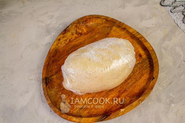 Переложите содержимое на рабочую поверхность и замесите эластичное тесто. Заверните в пленку и уберите в холодильник на 30 минут.