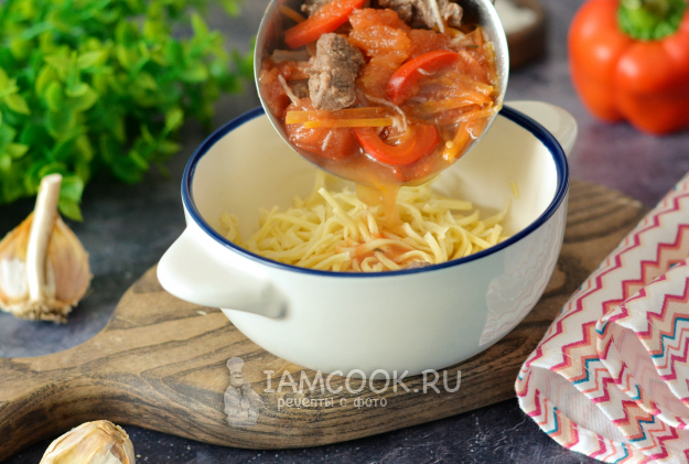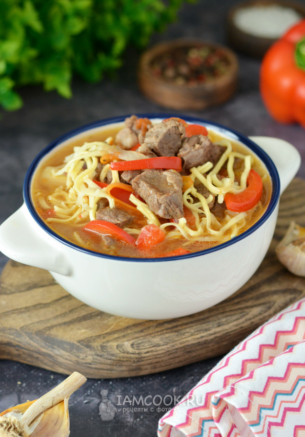 Лагман из баранины готов! Я люблю, когда в лагмане очень много соуса, чтобы он был похож почти на суп. Если вам нравится соус погуще, уменьшите количество воды.