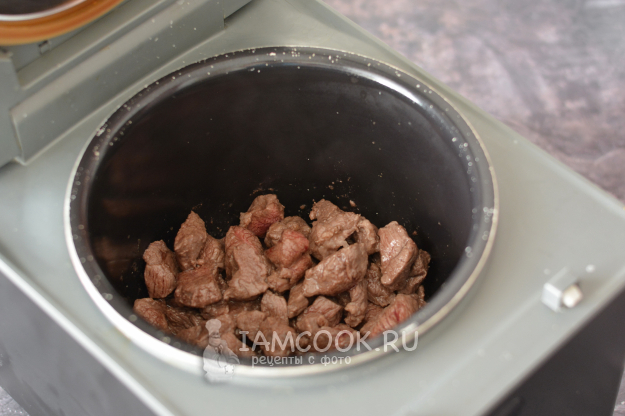 Установите на мультиварке режим "Жарка", влейте масло и хорошо нагрейте его. Добавьте в чашу мультиварки баранину и обжарьте её хорошенько около 5 минут. Крышка мультиварки должна быть открыта.