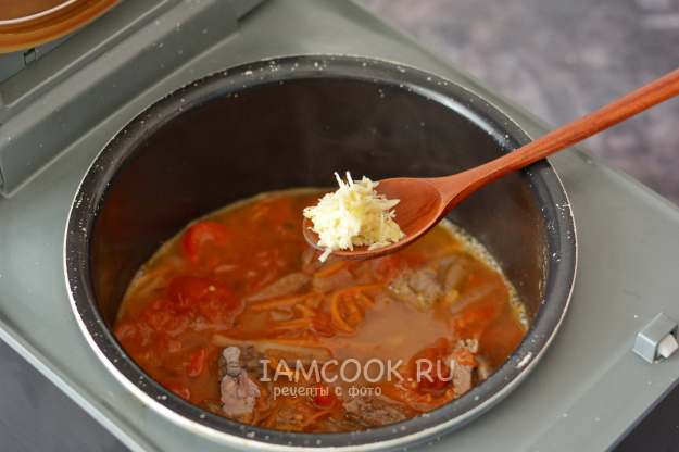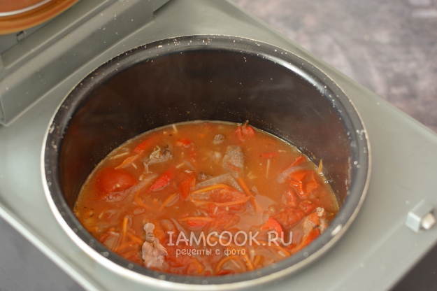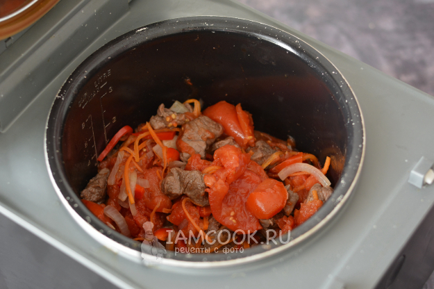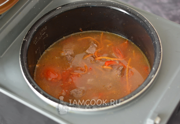 Переключите мультиварку в режим "Тушение" и закройте крышку. Готовьте лагман из баранины в мультиварке на режиме "Тушение" примерно 40-45 минут.
