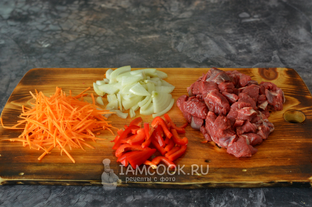 Нарежьте баранину крупным кубиком. Овощи нашинкуйте соломкой.