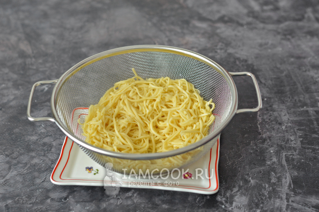 Лагманную лапшу отварите в большом количестве подсоленной воды и откиньте на сито. Время варки лапши внимательно прочтите на упаковке. Свежая лапша варится обычно 1-2 минуты, а сухая - не более 5 минут.
