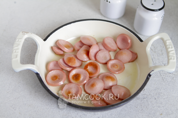 Первым делом хорошо разогреваем сковороду с кусочком масла. Масло можно использовать любое: сливочное, топленое, оливковое или растительное. Как только сковорода будет готова, забрасываем сосиски и слегка их обжариваем с двух сторон, до золотистой корочки. Буквально 2-3 минуты.