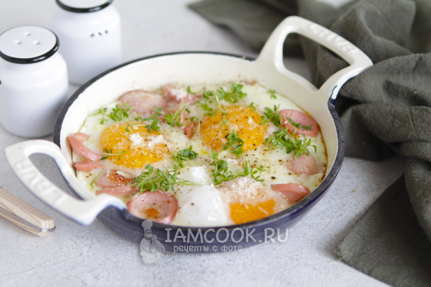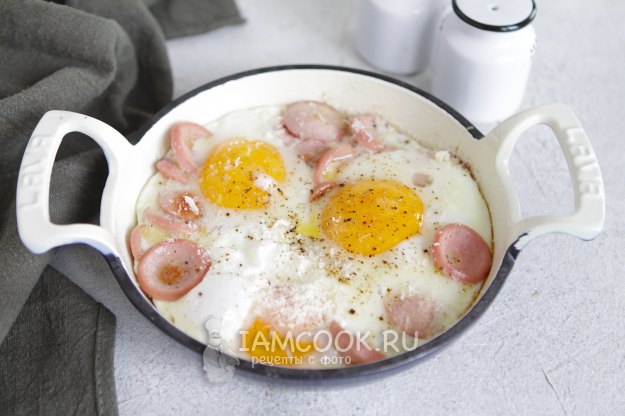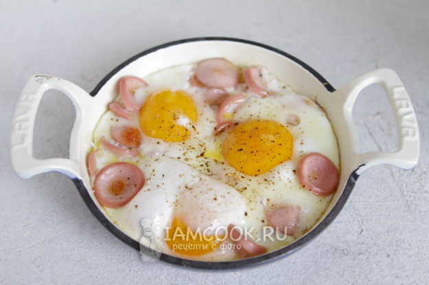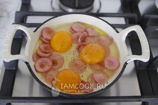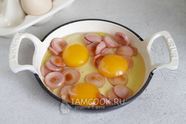 Аккуратно отодвиньте сосиски в стороны, освобождая место для яиц. По одному разбить яйца в подготовленную емкость. Яйца можно разбить сразу над сковородой или в отдельную емкость, а затем их просто перелить.