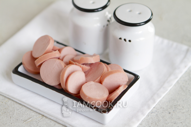 Для яичницы я выбрала куриные сосиски. Они у меня были небольшими по размеру, поэтому я взяла 2 шт. Сосиски необходимо очистить от оболочки, а затем нарезать произвольно.