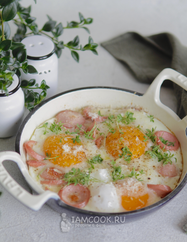 Перед подачей яичницу с сосисками и сыром рекомендую слегка украсить свежей зеленью.