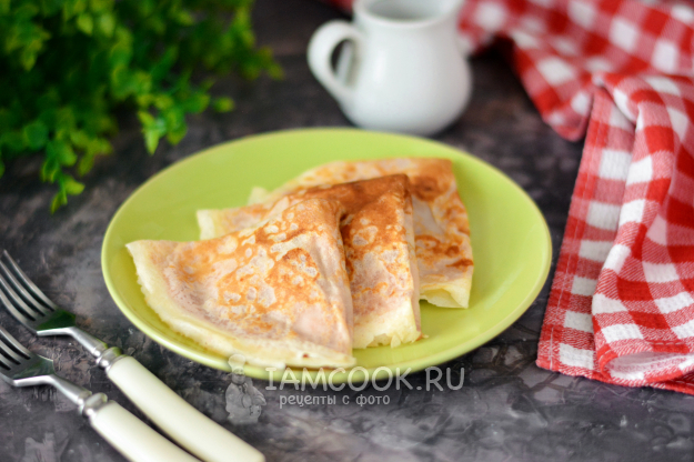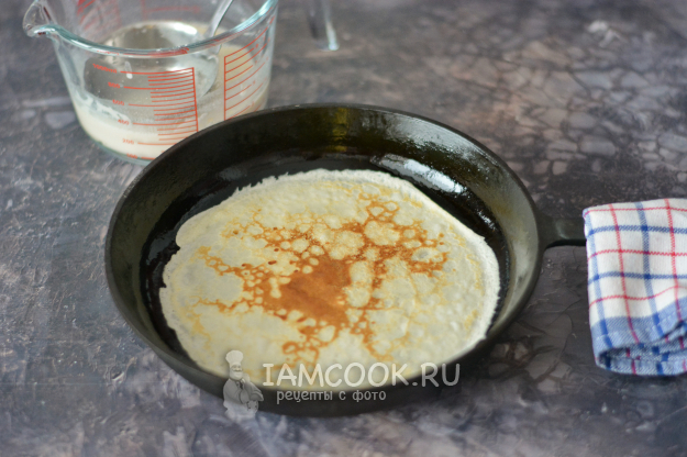 На разогретой сковороде выпекайте тонкие блинчики, наливая небольшое количество теста. Маслом сковороду можно не смазывать, так как оно добавлено в тесто.
