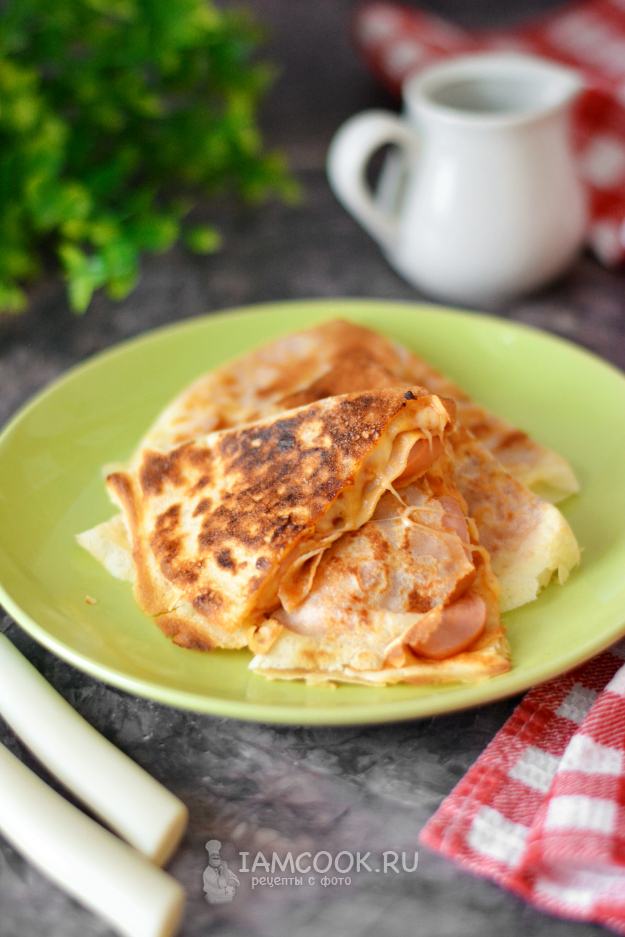 Готовые блины с сосисками и сыром прогрейте на сковороде, чтобы сыр расплавился. Подавайте к столу горячими!