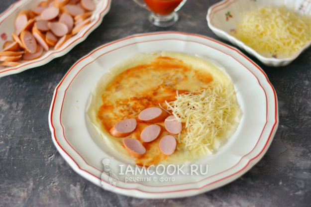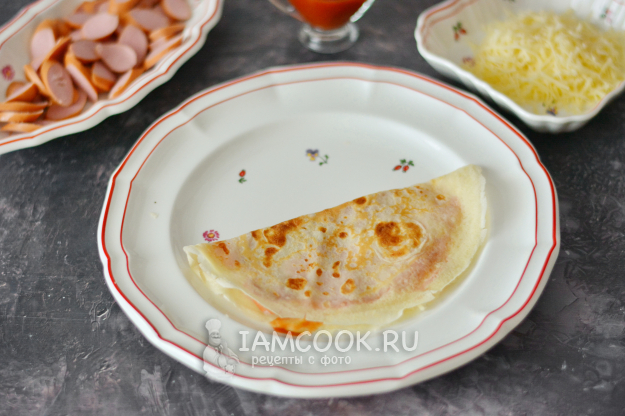Каждый блинчик смажьте слегка кетчупом. И на половину блина выложите сосиски и сыр.