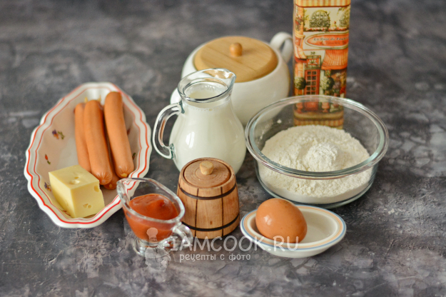 Соберите по списку все продукты для приготовления блинов с сосисками и сыром.