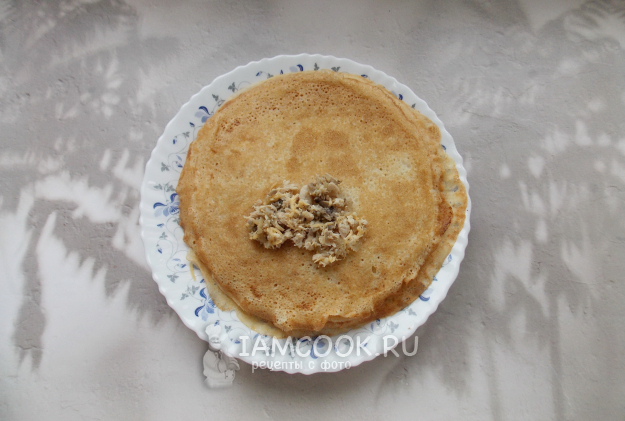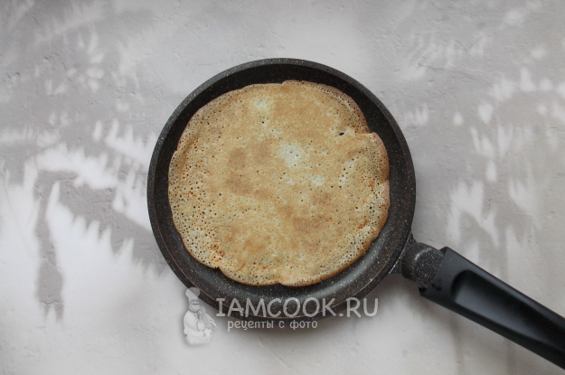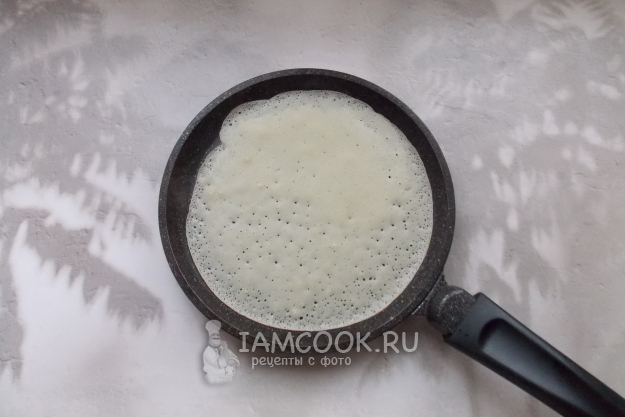 Сковороду хорошо нагрейте. Если она у вас с антипригарным покрытием, то смажьте её только один раз - перед выпеканием первого блина. Налейте половником тесто, тонким слоем распределяя его по сковороде.