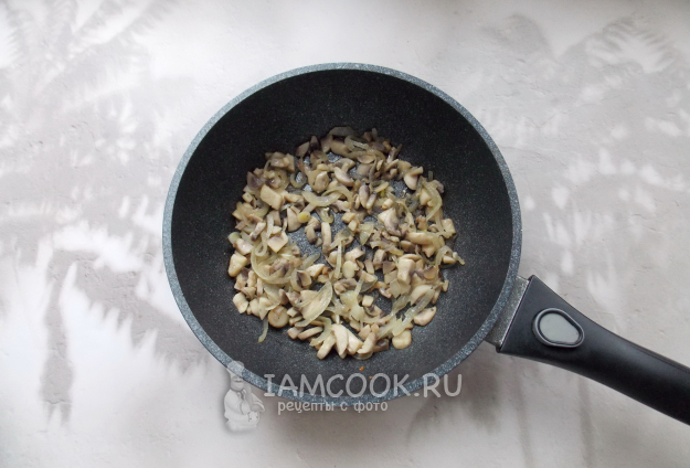 Грибы и репчатый лук очистите, помойте и нарежьте не очень крупно. Выложите в сковороду и налейте растительное масло.