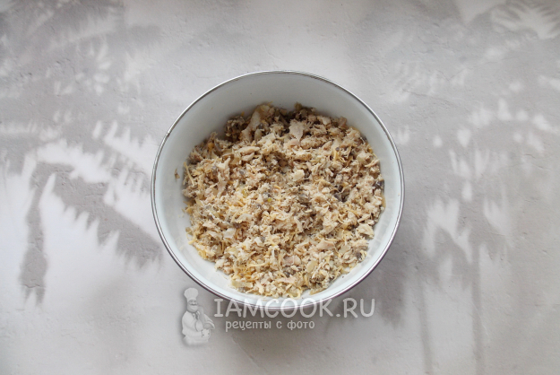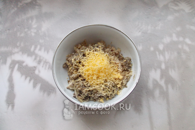Куриное филе отварите. Для этого выложите его в кастрюлю и залейте водой. Доведите до кипения. Затем огонь убавьте и снимите пену. Варите филе до мягкости, 15-20 минут. Время приготовления зависит от толщины филе. После немного охладите. Измельчите куриное филе и грибы с луком в блендере или мясорубке. Добавьте тертый сыр.