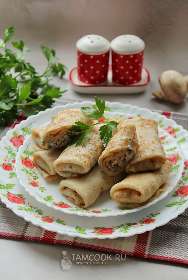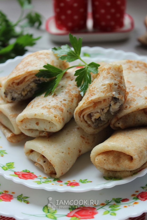 Соберите ингредиенты для приготовления блинов с курицей, грибами и сыром.