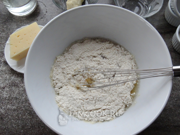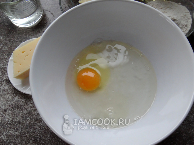 В миску разбить яйцо, влить масло и воду, добавить соль и сахар.
