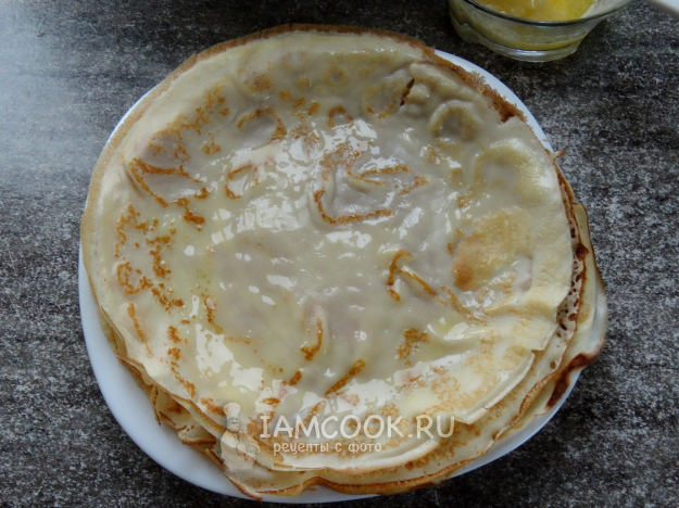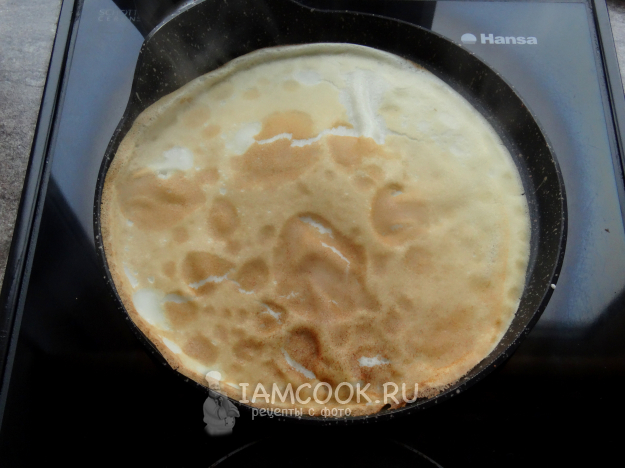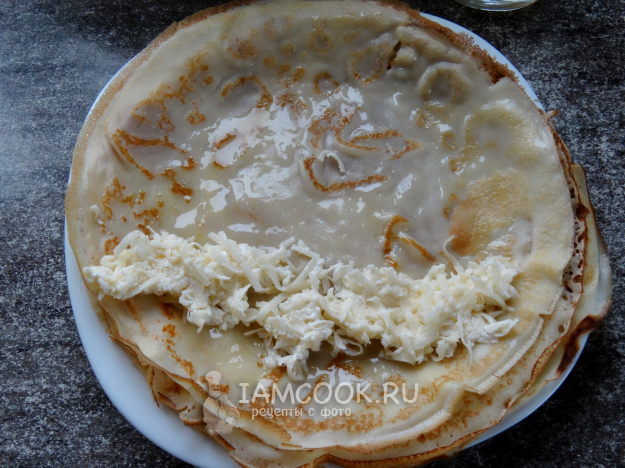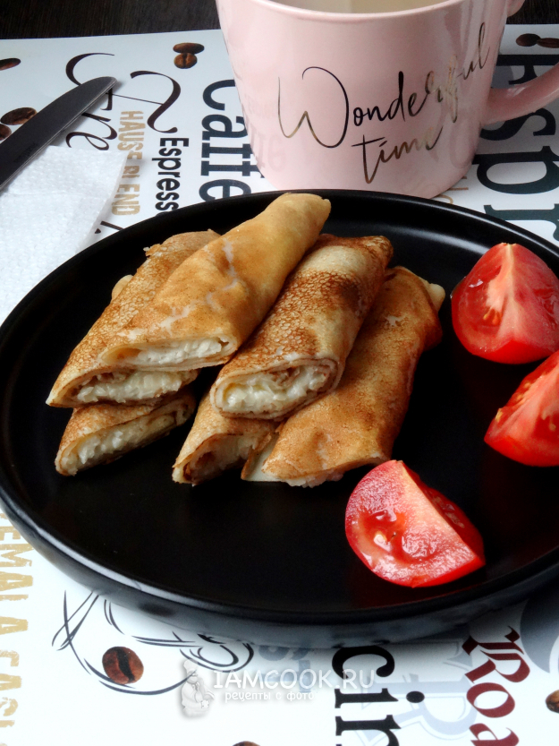 На край выложить сырную начинку. Свернуть блин трубочкой.