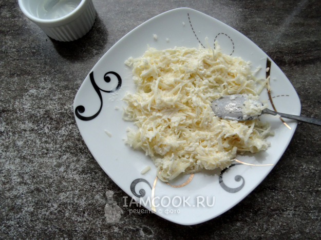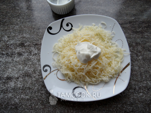 Сыр и чеснок натереть на мелкой тёрке, добавить сметану.