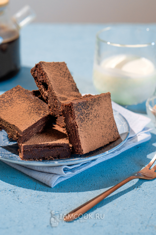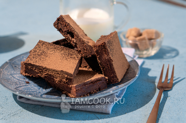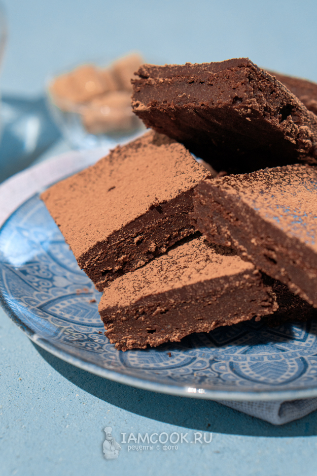 Теперь можно дождаться, пока ганаш схватится, и уже подавать к столу еще слегка теплым. Я оставила брауни с маскарпоне и ганашем на ночь и разрезала десерт уже утром. Потому что утром, после холодильника, это брауни напоминает трюфельные конфеты с тающим корпусом.