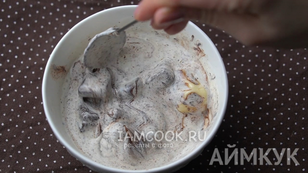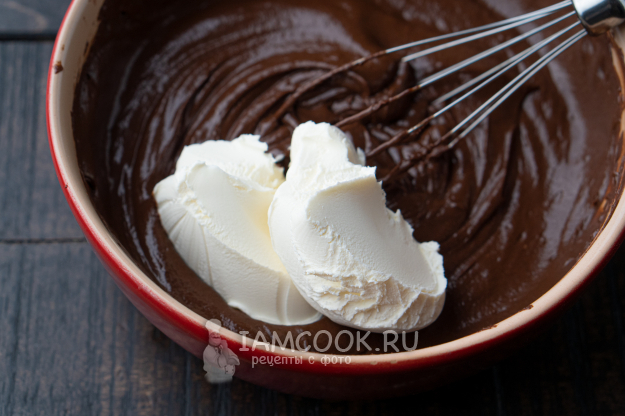 Далее вводим маскарпоне. Сначала будет сложно его вмешать в тесто, потребуются усилия.
