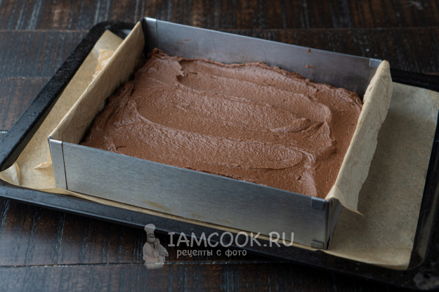 На теплый, не горячий брауни выкладываем массу и разравниваем.