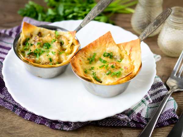 Запекайте жульен в духовке при 180-190°С примерно 15-20 минут, чтобы сыр расплавился и подрумянился.