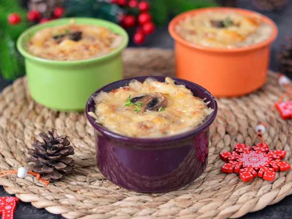 Кокотницы (или другие формы для жульена) наполните грибами с колбасой.