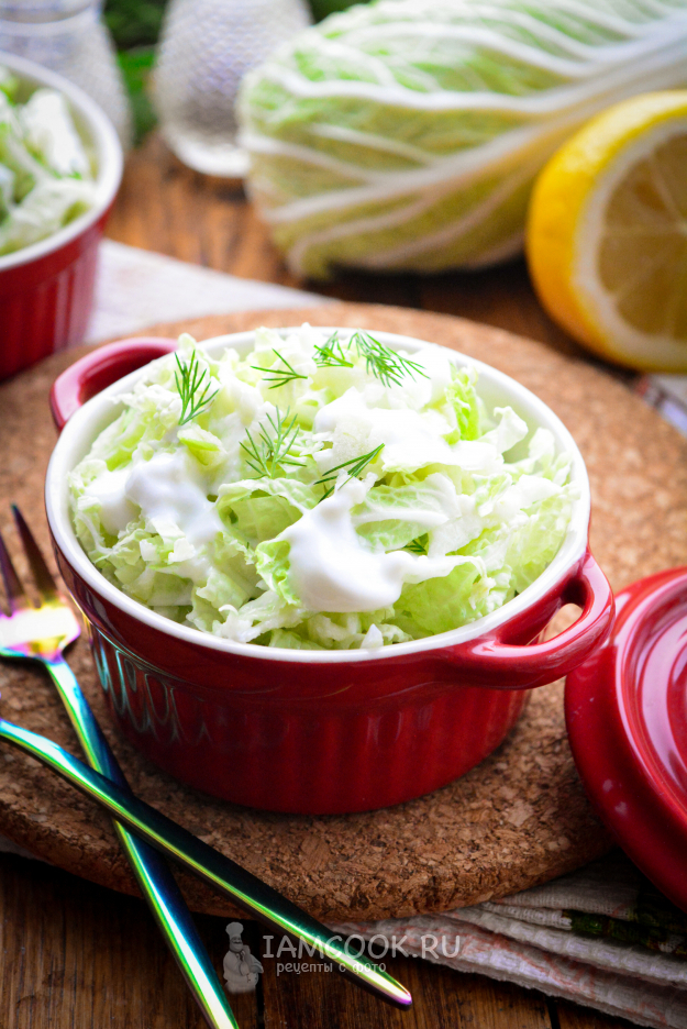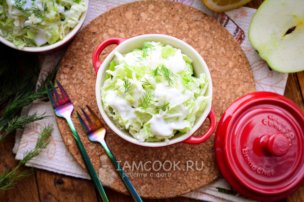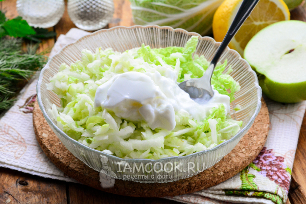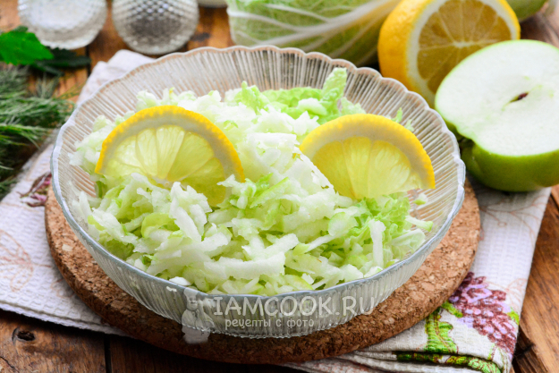Готовое блюдо сразу подавайте к столу. Добавьте свежую зелень и можете накрывать на стол. Салат из пекинской капусты с яблоком отличается сочностью и нежностью, имеет пикантный вкус и освежающий аромат.