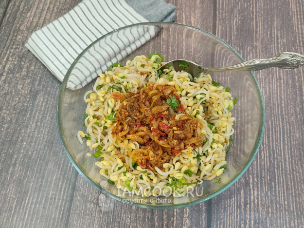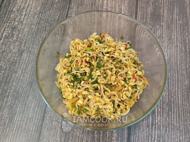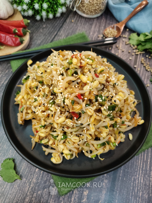 Пророщенная соя по-корейски готова! Можно есть сразу, но если дать закуске постоять в холодильнике пару часов, она станет только вкуснее).
